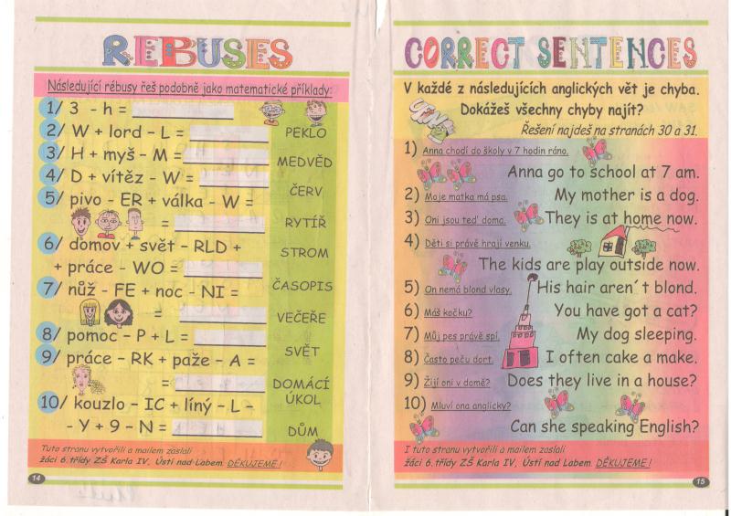 Žáci VI. třídy tvoří Ufina Posted on 25.4.201220.5.2012 by ZŠ KARLA IV. V rámci hodin anglického jazyka žáci vytvořili několik rebusů a hádanek, které následně vyšly v novém Ufinovi.