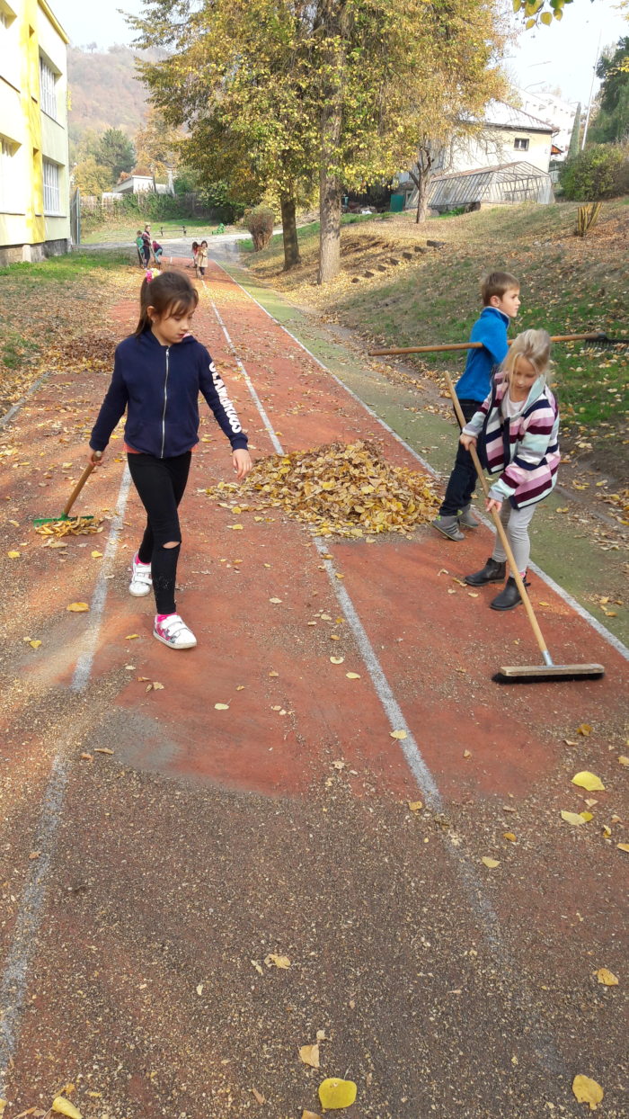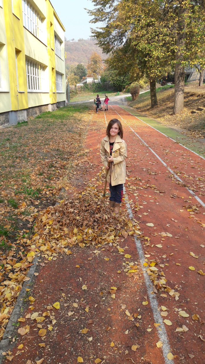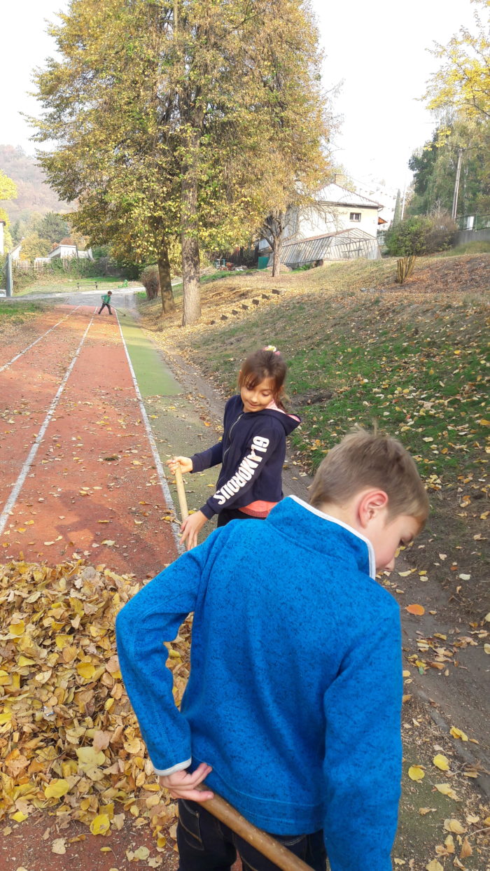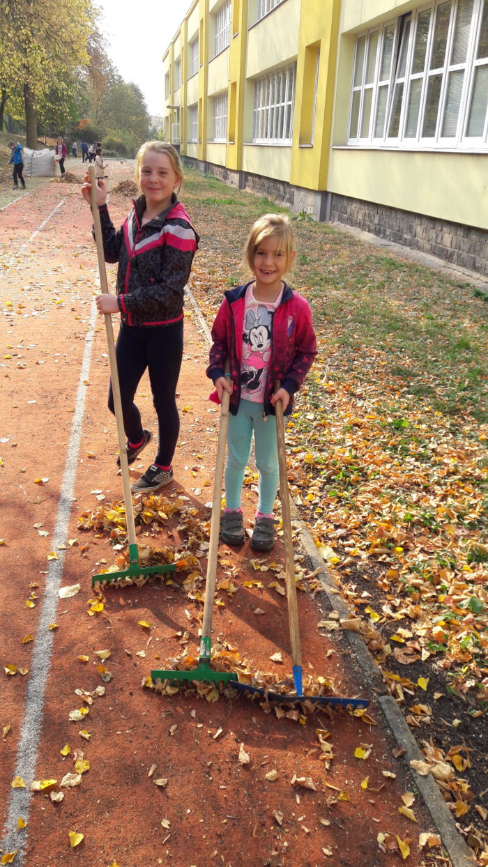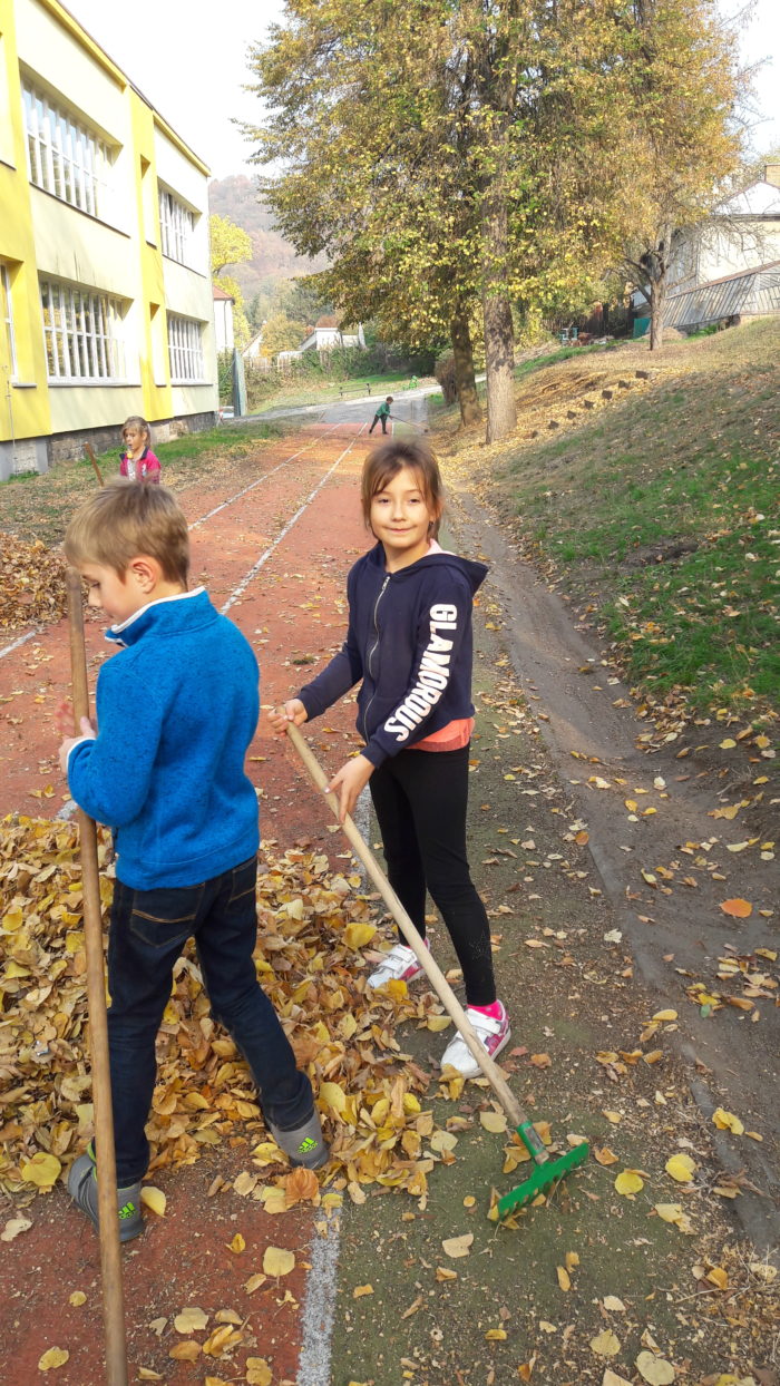 Pomalu nastal podzim, s dětmi jsme se pustili do úklidu školní zahrady. Nejprve jsme sesbírali kaštany a ořechy a na konci října jsme se vrhli na hrabání listí. Děti ze školní družiny práce moc bavila a povedlo se jim dokonce naplnit velký vak na listí.