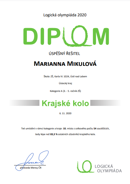 Krajské kolo Logické olympiády Posted on 11.12.20209.1.2021 by ZŠ KARLA IV. Žákyně naší školy Marianna Mikulová z 5.A se velmi krásně umístila v krajském kole logické olympiády, a to na 10. místě z celkového počtu z 54 soutěžících. Mgr. Jitka Plašilová
