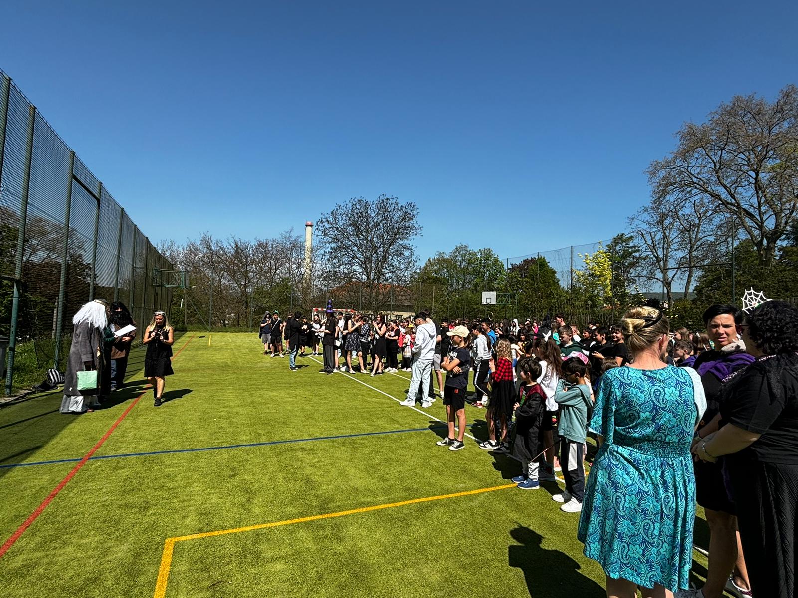 Po uplynutí třetí vyučovací hodiny se všechny děti s učiteli přesunuli na zahradu, kde také probíhalo současně několik aktivit. Pět vybraných zástupců z každé koleje hrálo Famfrpál. Mnoho dětí si sedlo okolo hřiště a sledovalo podívanou, jiné raději zavítaly do stánku s Bertíkovy fazolkami, a dobrovolníci z devátých tříd měli možnost hledat „Tajemnou komnatu“ – procházeli postupně kabinety ve škole, kde na ně čekali rébusy, které je zavedli nakonec až k Lordu Voldemortovi.