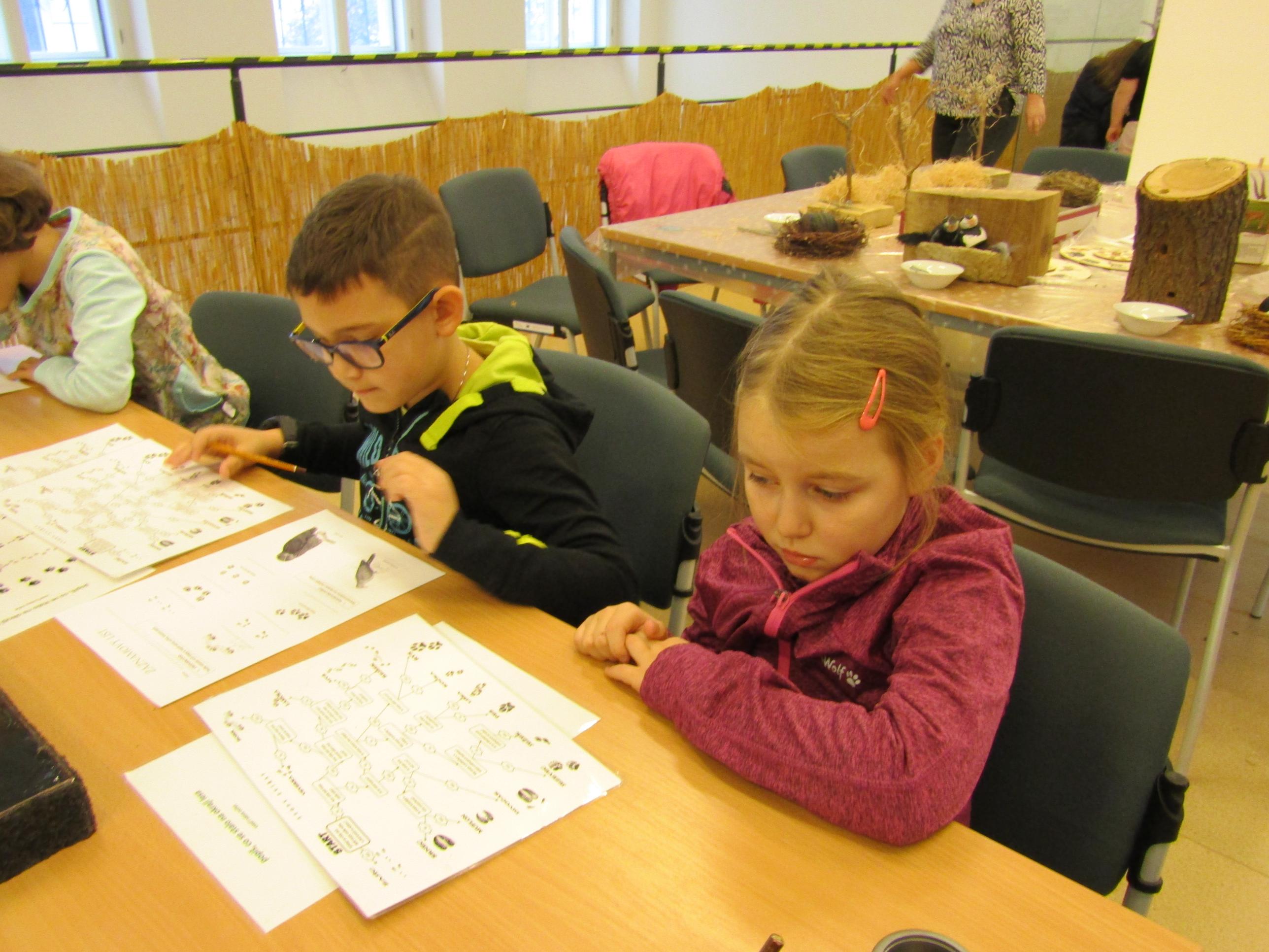 Pracovali jsme ve dvojicích na několika stanovištích. Dozvěděli jsme se spoustu nových a zajímavých informací o tom, co po sobě zanechávají zvířata v lese. Už víme, jak je poznat podle stop i podle toho, co po sobě zanechala. Víme, že to nemusí být pouze jejich trus, ale i kůže, srst, ohlodané či okousané větve, hnízda, nory atd.. vyzkoušeli jsme si, pomocí pinzet , jak je těžké postavit hnízda pro ptáky, krmili jsme ptačí mláďata housenkami, mouchami a žížalami … vůbec to nebylo jednoduché…