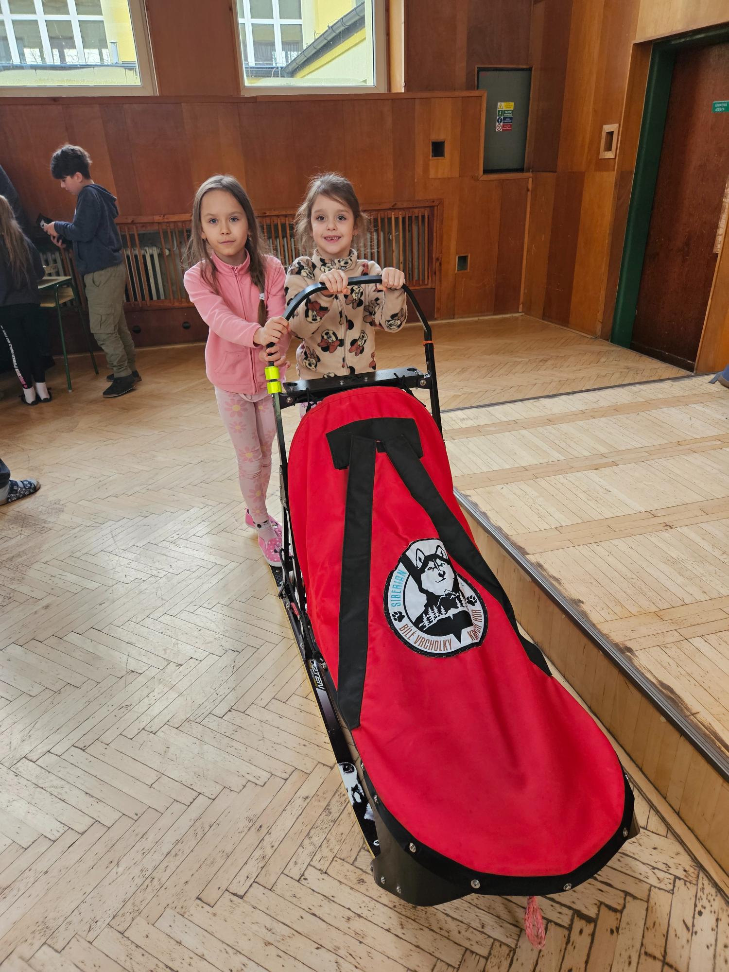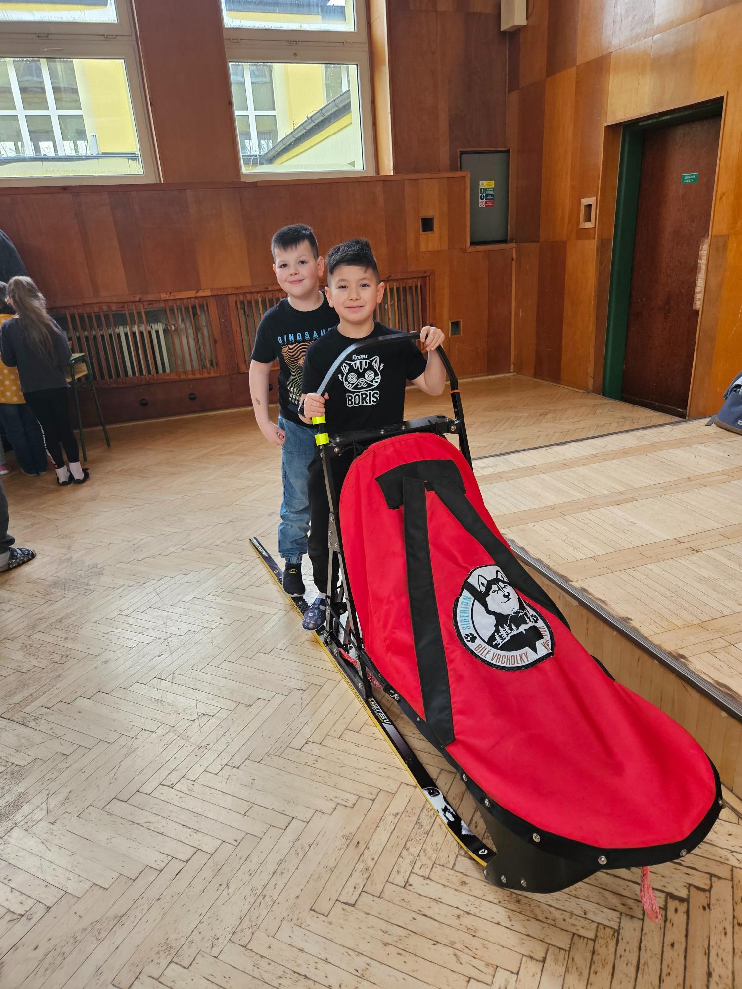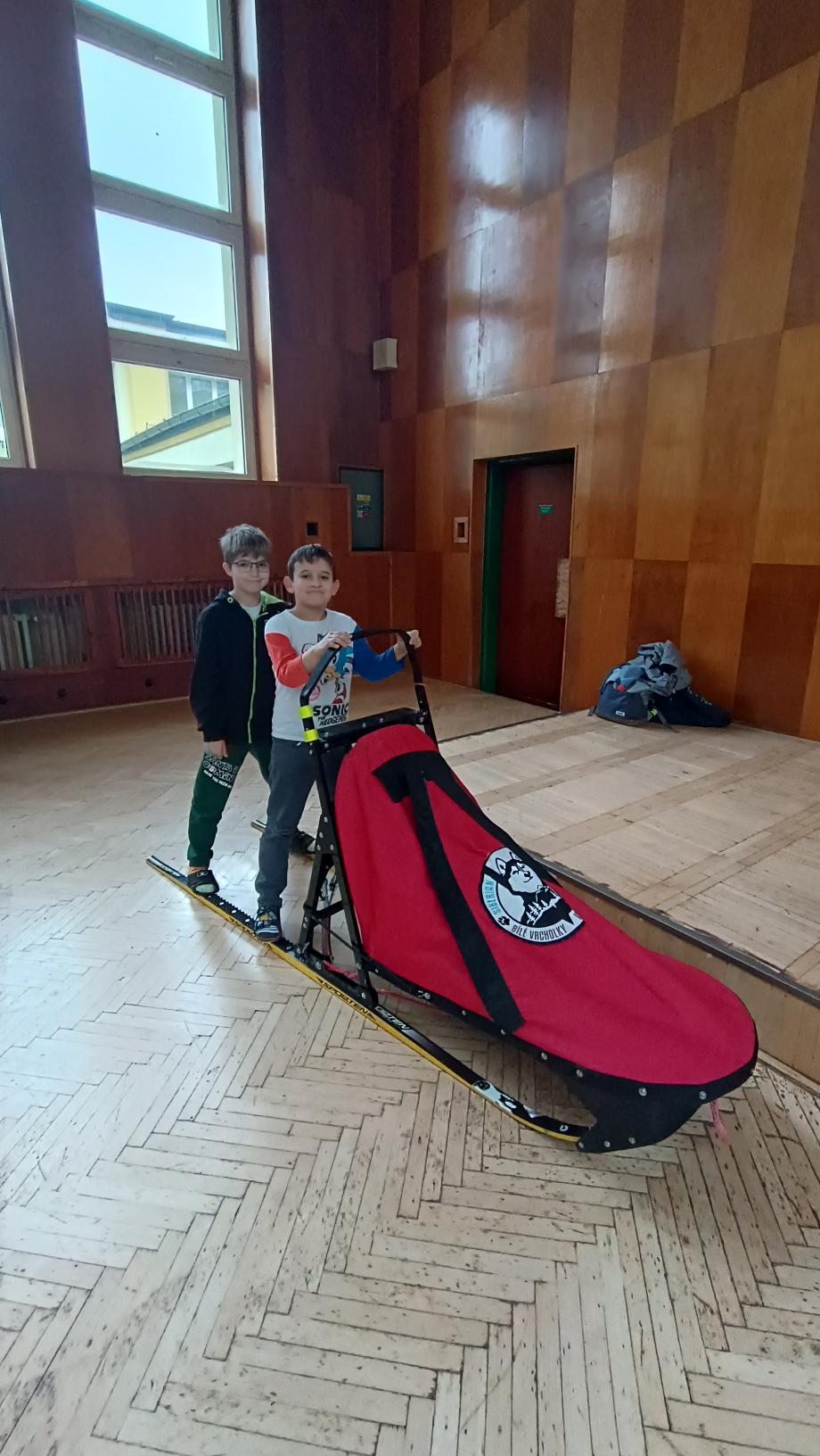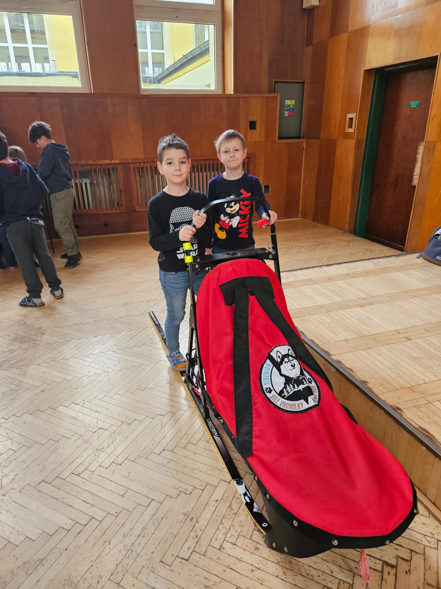 Do naší družiny za námi přijela musherka Věra Gráfová se svými psy husky a pan Radek Jareš. Paní musherka nám představila své 2 psy, povídala o jejich původu, schopnostech, povaze, o potřebě pohybu. Pan Jareš odpovídal na zvídavé dotazy děti – např. co psi jedí, kolik váží, jak těžké sáně uvezou atp. Pak si děti mohly závodní sáně prohlédnout a vyzkoušet. Ovšem největší radost děti měly, když si mohly pohladit a pohrát se psy.