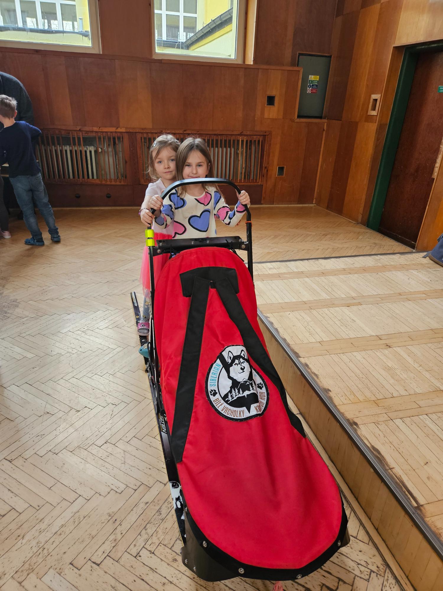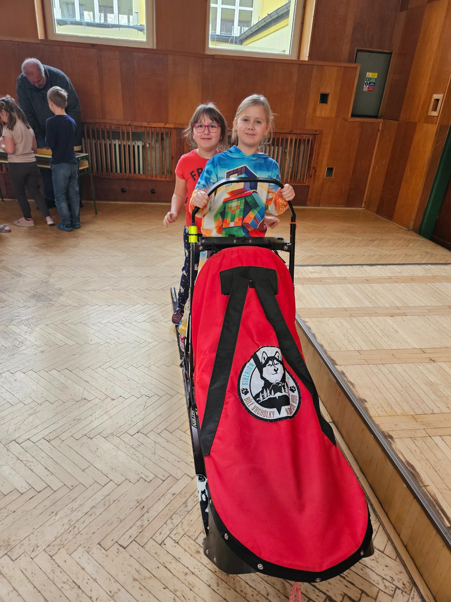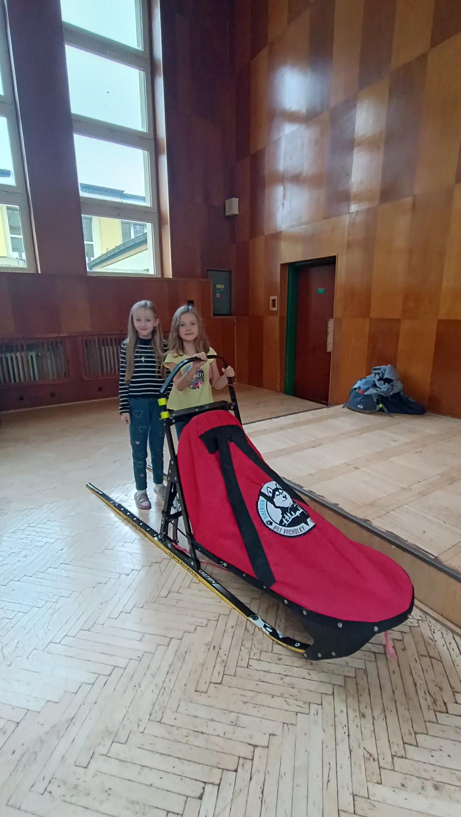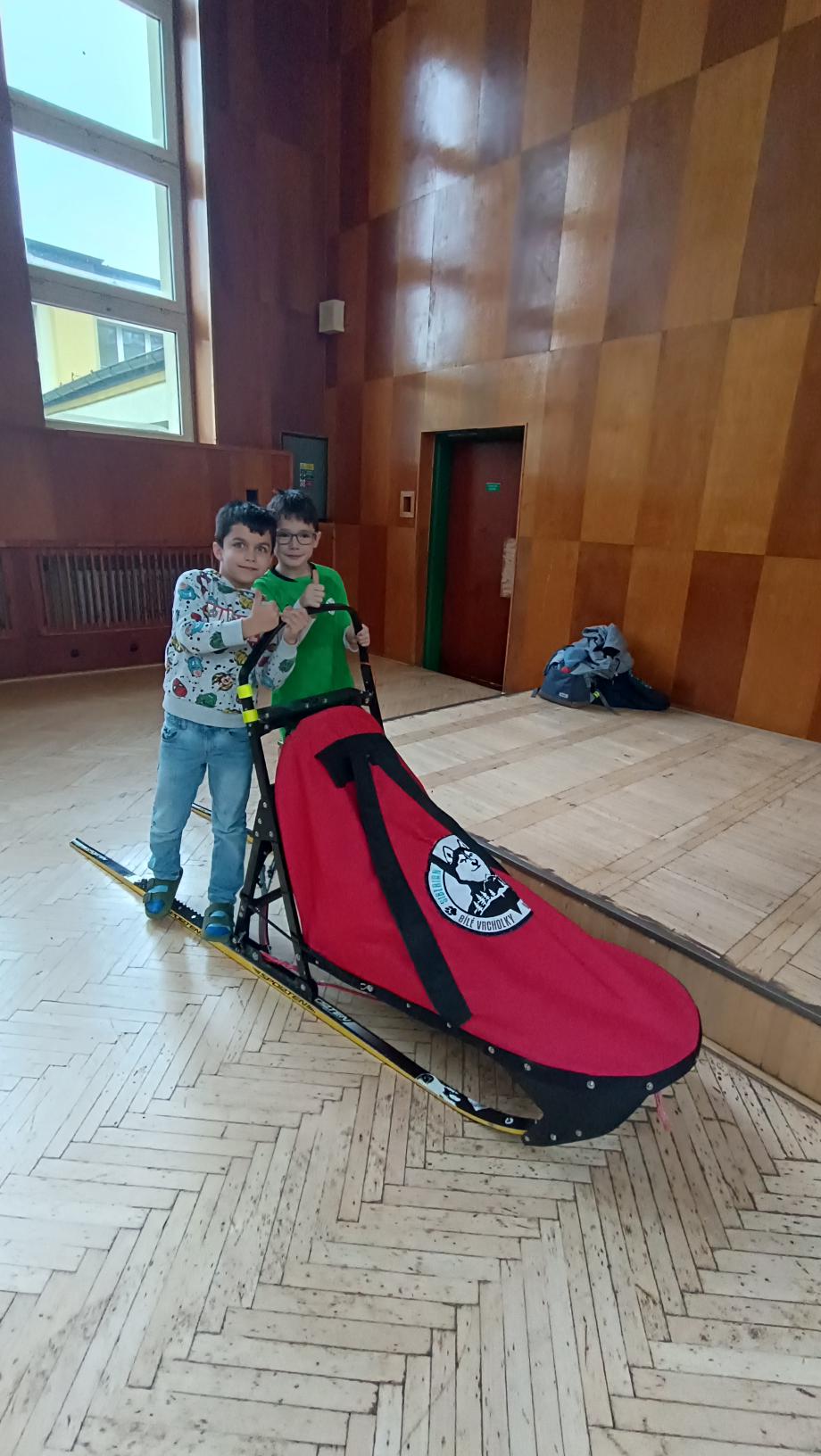 Do naší družiny za námi přijela musherka Věra Gráfová se svými psy husky a pan Radek Jareš. Paní musherka nám představila své 2 psy, povídala o jejich původu, schopnostech, povaze, o potřebě pohybu. Pan Jareš odpovídal na zvídavé dotazy děti – např. co psi jedí, kolik váží, jak těžké sáně uvezou atp. Pak si děti mohly závodní sáně prohlédnout a vyzkoušet. Ovšem největší radost děti měly, když si mohly pohladit a pohrát se psy.