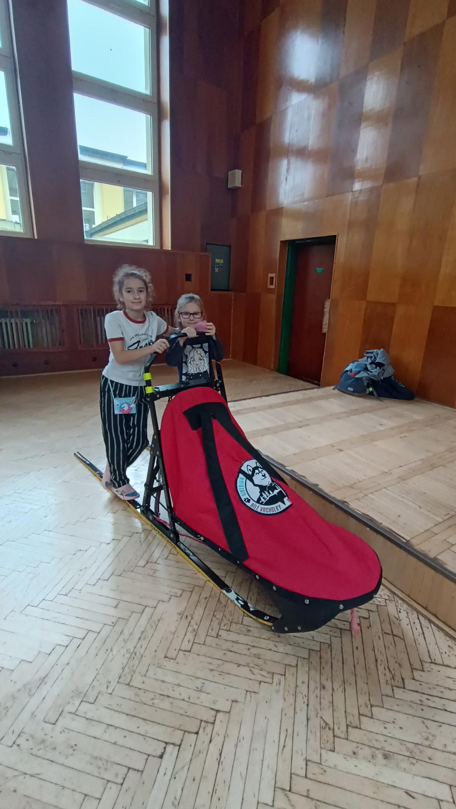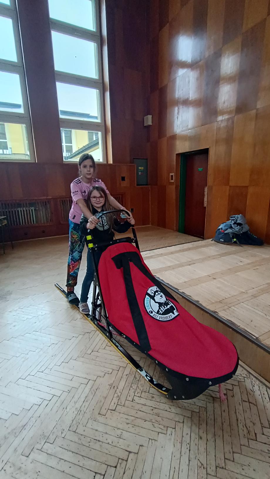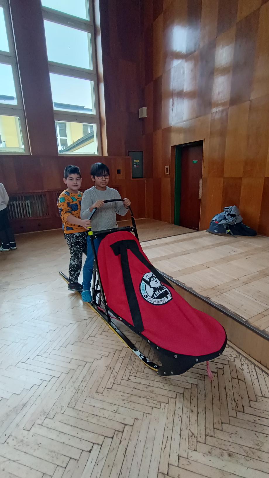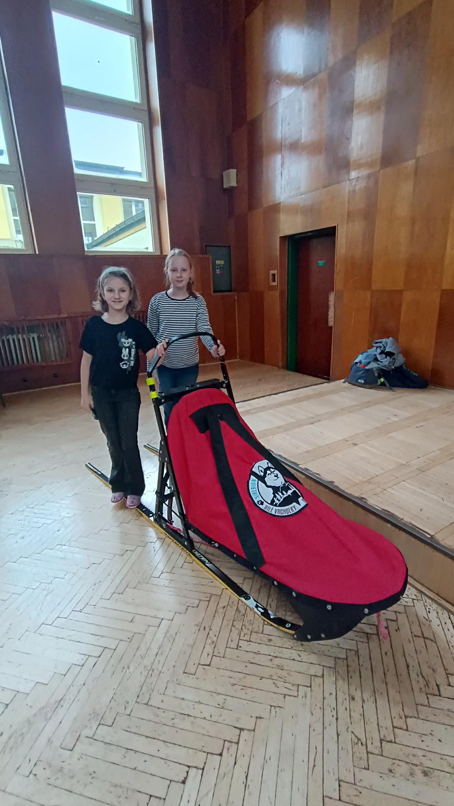 Do naší družiny za námi přijela musherka Věra Gráfová se svými psy husky a pan Radek Jareš. Paní musherka nám představila své 2 psy, povídala o jejich původu, schopnostech, povaze, o potřebě pohybu. Pan Jareš odpovídal na zvídavé dotazy děti – např. co psi jedí, kolik váží, jak těžké sáně uvezou atp. Pak si děti mohly závodní sáně prohlédnout a vyzkoušet. Ovšem největší radost děti měly, když si mohly pohladit a pohrát se psy.